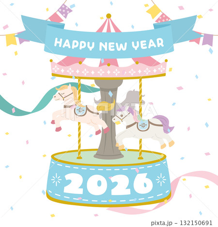 2026 匹馬年可愛旋轉木馬新年卡片模板