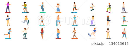 Girl skateboard icons set. Large set of young men and women skateboarding on different skateboards