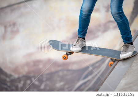 Legs of Skateboarder skateboarding in modern city