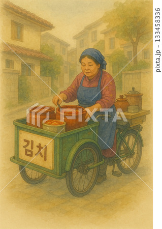 街頭賣泡菜的韓國阿嬤手繪插畫