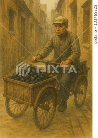 基里班城堡街道上騎著三輪車的男子 | 阿朱城堡城市生活水彩畫