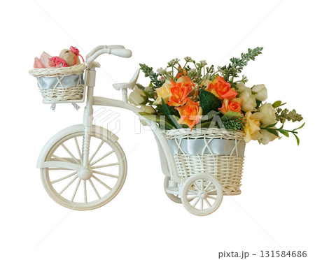 A prop for decorating a vintage style room that is a white tricycle with colorful flowers in a basket on the back isolated on transparent background
