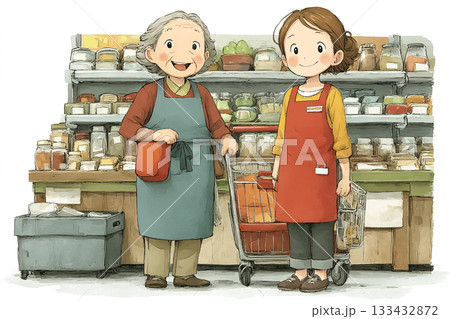 護理人員幫助老人購物的水彩插圖(透明PNG)