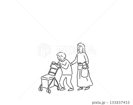 一位老婦人推著一輛銀色手推車行走,旁邊站著一位女士,線條畫。