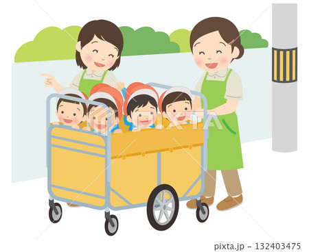 孩子和幼兒園老師搭乘童車前往附近的公園