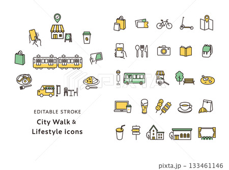 與在城裡散步和外出相關的圖標集(單色)