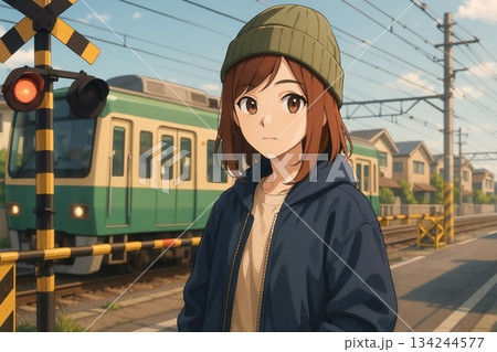 鐵路道口和穿冬衣的女孩
