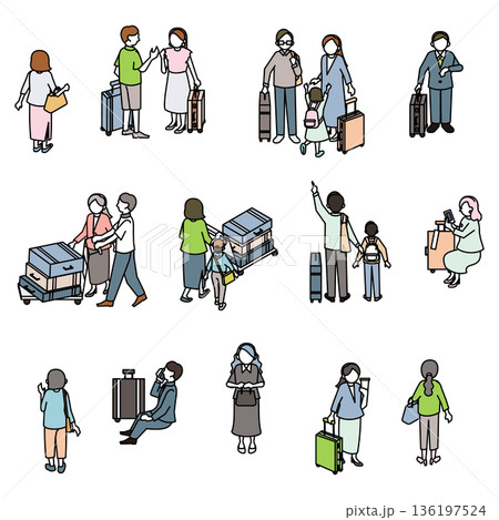 一組等距視角的家庭和遊客照片——人們推著行李車、提著行李箱旅行