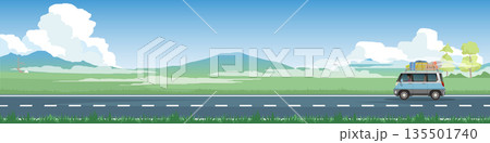 Vector illustration of travels van car with luggage on the roof rack and driving man for banner. Asphalt road near the meadow with wisps of mist and mountain under clear sky. Copy Space Flat Vector.