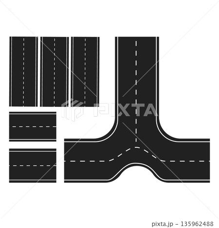 Assortment of road elements including curves, straights, and intersections, perfect for building custom road maps and game levels.