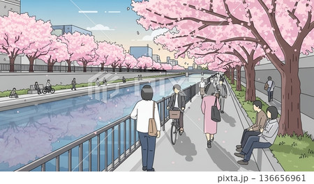 櫻花在河邊搖曳,人們過著平靜的生活。