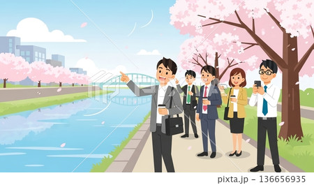 春日的陽光,櫻花盛開,還有沿著河邊散步的上班族。