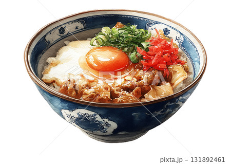 gyudon beef rice bowl with york eeg, hand-drawn watercolor illustration