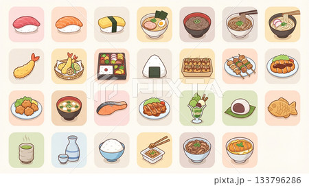 日本食物圖示插圖集壽司、拉麵、章魚燒和飯糰等向量材料