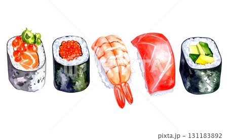 水彩插圖、手繪插圖、模擬插圖、海鮮散壽司
