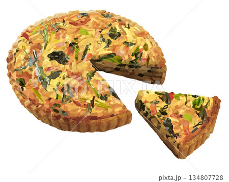 Single one line drawing quiche lorraine with a sprinkling of celery leaves on a round wooden cutting board. A savory pie. National Quiche Lorraine Day. Continuous line design graphic illustration
