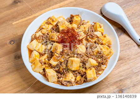 麻婆豆腐,經典的中國菜,盛放在白色盤子裡。