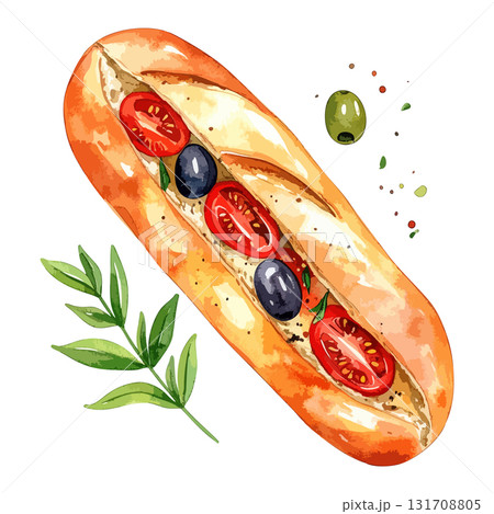 Watercolor baguette loaf with crisp crust, golden brown color, bakery style, artisan bread, delicious and fresh, isolated on white background