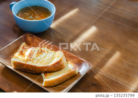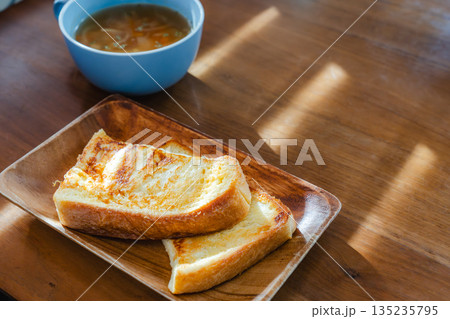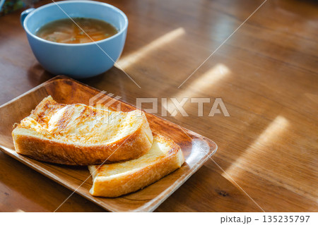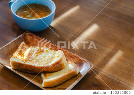 在清晨的陽光下,享用著法式吐司和湯的早餐。