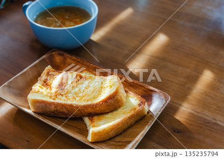 在清晨的陽光下,享用著法式吐司和湯的早餐。