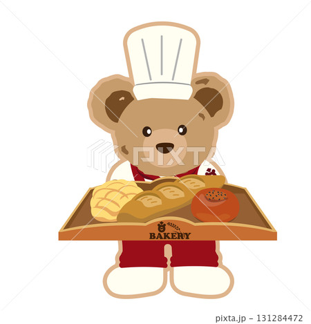 一隻泰迪熊拿著一個木托盤,托盤上放著各種麵包的插圖