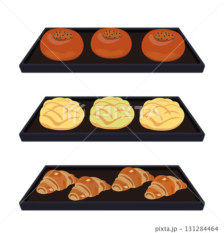 烤盤上的紅豆麵包、蜜瓜麵包和羊角麵包的向量插圖