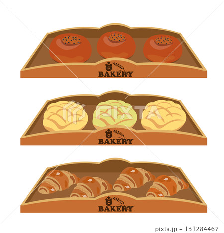 木托盤中的紅豆餅、甜瓜麵包和羊角麵包的向量圖