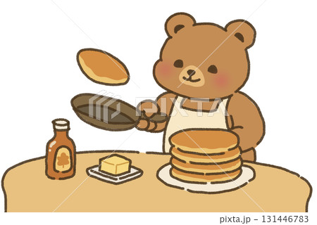 一隻熊把楓糖漿塗在煎餅上