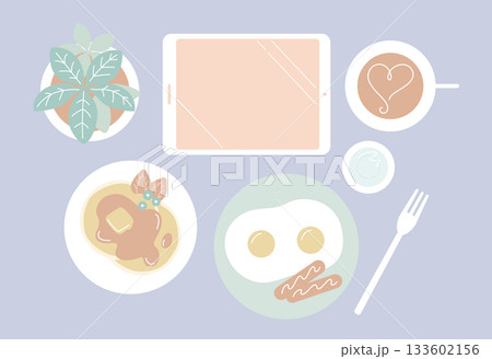 柔和色調的平板電腦和早餐套裝 / 煎餅和煎蛋的早餐平鋪擺放(帶背景色)
