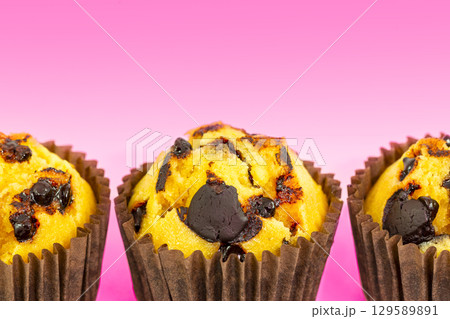 Fresh homemade delicious vanila and chocolate muffins in paper cupcake holder isolated on pink colour background. With copy space for texts.