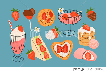 Strawberry set. Summer refreshing drinks, sweets and desserts with taste of strawberries. Chocolate strawberry. Flowers, petals, strawberries. Flat Vector hand drawn cartoon illustration isolated