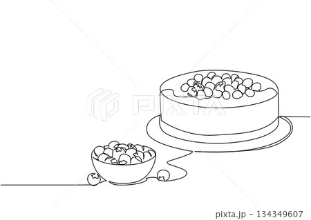 Single continuous line drawing round cheese cake with blueberry topping and small bowl filled with blueberries. Very tasty. National Blueberry Cheesecake Day. One line design vector illustration