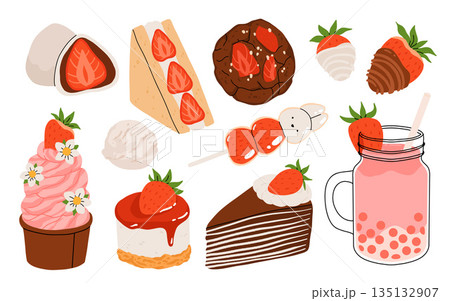 Strawberry set. Summer sweets and desserts with taste of strawberries. Chocolate strawberry, cookie, sandwich, mochi, cheesecake, tanghulu. Flat Vector illustration with flowers and leaves.