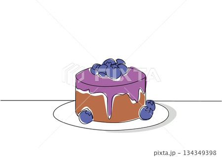 Single one line drawing round cheese cake with blueberry topping on a small plate. A dish to complete a long holiday. National Blueberry Cheesecake Day. Continuous line design graphic illustration
