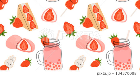 Strawberry flat vector seamless pattern. Summer drinks, sweets and desserts with taste of strawberries. Chocolate strawberry, cookie, sandwich, mochi, cheesecake, tanghulu.