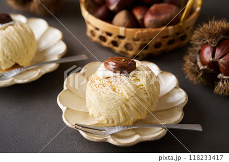 在咖啡館享用濃鬱的蒙布朗。秋天的甜點時間。