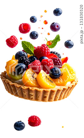 一幅靜物廣告圖,角落放著一小塊水果塔。