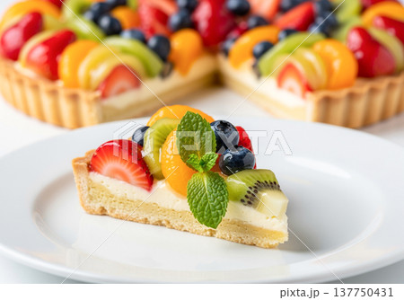 一塊塔,配上簡潔的白色背景,突顯了食材的鮮豔色彩。