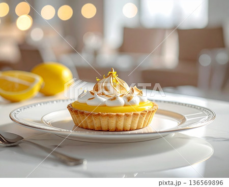 檸檬塔上淋著濃稠糖漿,露出上面的蛋白霜奶油。
