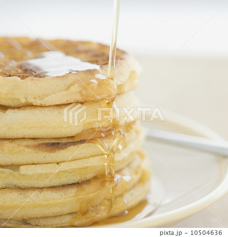 Close up of syrup pouring on waffles