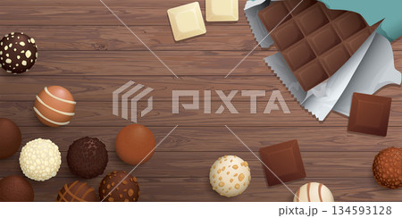 Various chocolate balls and chocolate bar top view on wooden background graphic illustration have blank space.