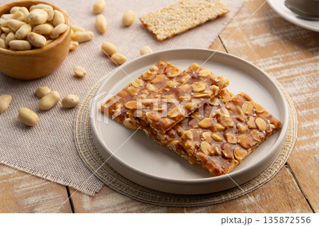 Chinese Peanut and Sesame Bar,Peanut brittle crisp candy in a plate.Thai snack.