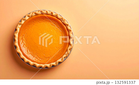 An overhead shot of a single, whole pumpkin pie on a minimal orange background with copy space.