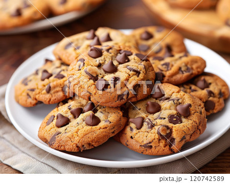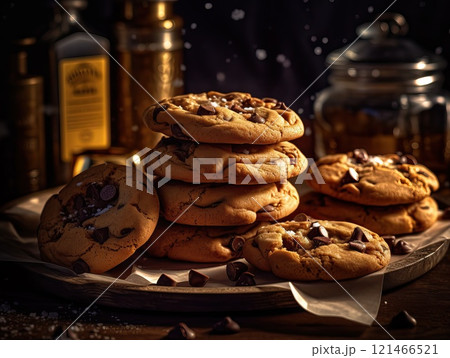 Tasty homemade chocolate cookies on wooden table. Generative AI