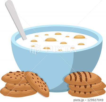 Cartoon rendering of a light blue bowl filled with cereal and stacked chocolate chip cookies.