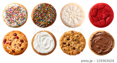 Collection of round cookie cookies biscuit, sprinkle and icing set, on transparent background cutout. PNG file. Many assorted different flavour. Mockup template for artwork design