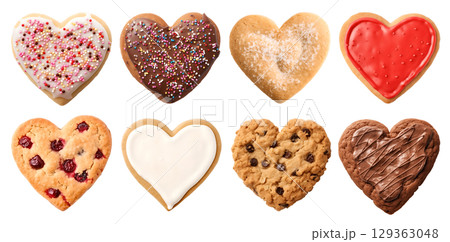 Heart Love shape cookie cookies biscuit, sprinkle and icing set, on transparent background cutout. PNG file. Many assorted different design. Mockup template for artwork design
