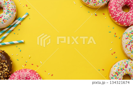 Assorted Colorful Doughnuts with Sprinkles on White Background with Textured Design