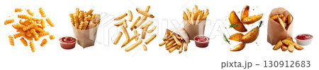 Collection of 3 potato fry chips, Potato wedges, french fries, Crinkle cut wavy in stack pile, packet paper wrap ketchup, fly scattered on transparent cutout PNG. Mockup template