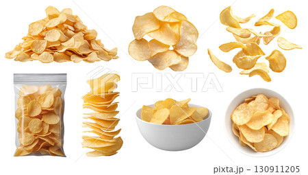 Potato chip chips, many angles and view side top front heap broken pile bowl packet foil stack on transparent background cutout, PNG file. Mockup template